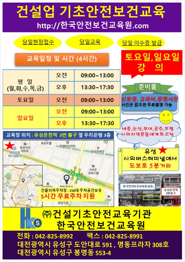 온라인 교육은 없다고 합니다.무조건 오프라인에서 교육을 받아야 하고, 고용노동부와 안전보건공단에서 인증받은 기관에서만 이수가 가능하다고 합니다.불법으로 취득한 이수증은 현장에서 바로 적발되므로 반드시 확인된 기관에서 받으시길 권장합니다.나는 집에서 가까운 거리에 교육을 받을 수 있는 기관이 있어서 바로 전화를 걸어 방문해서 교육을 받게 되었습니다.